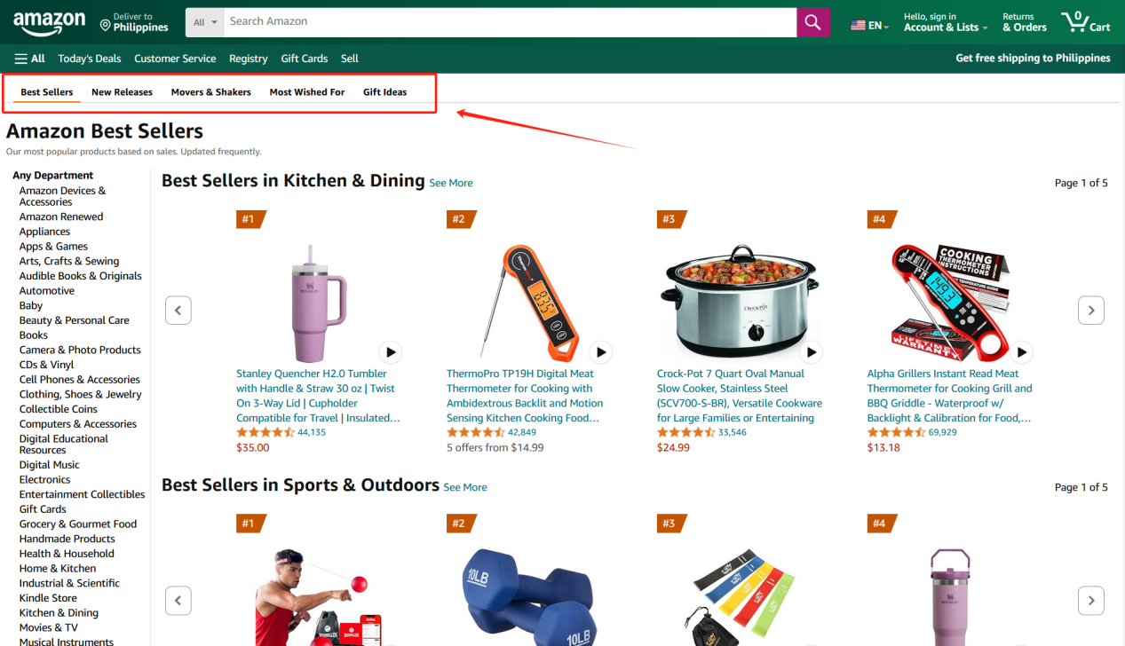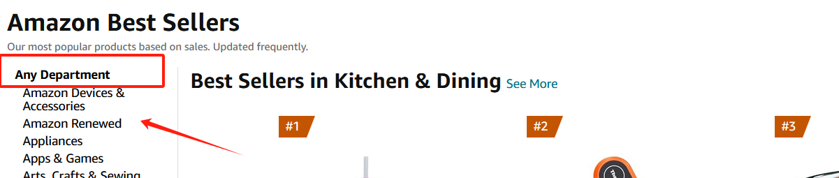 倘若有些卖家对当前浏览的类目兴致索然,或者缺乏与之匹配的优质资源,也无需担忧。卖家可点击 Any Department 栏目,接着依次浏览 Any Department 栏目下的各个类目(如下图)。只要依据自身资源优势,对感兴趣的类目重复上述选品步骤,最终总能挖掘出与自身运营能力相得益彰的产品,从而为在亚马逊平台上取得成功奠定坚实的选品基础。