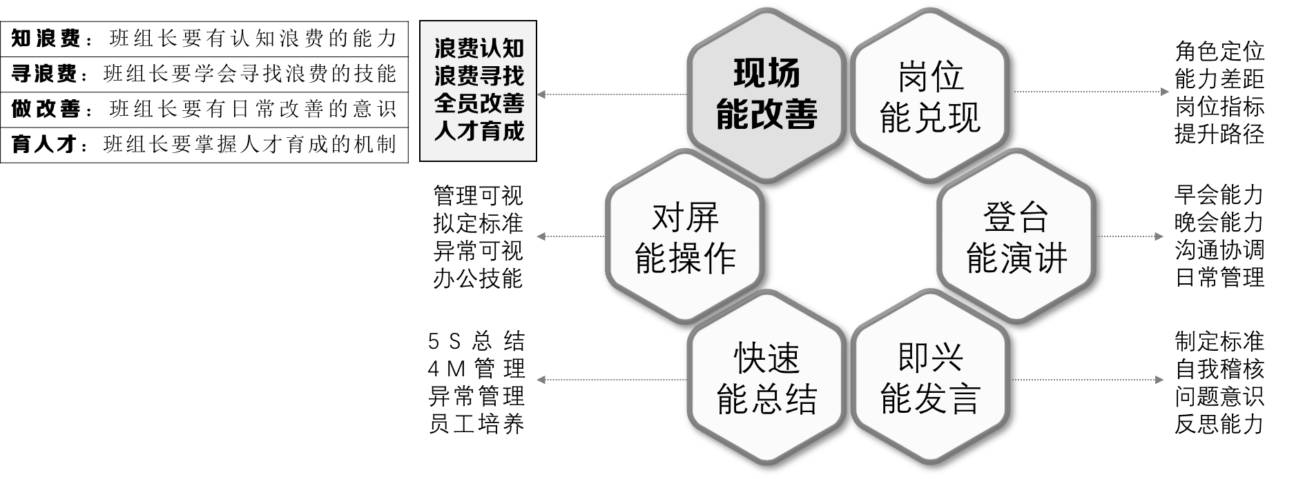 现场能改善:基层班组长在班组长这个岗位上,必须要具备识别浪费的能力,进而对浪费进行持续改善。一个精益的班组长绝对不会对现状进行满足,精益班组长经常做的事情就是识别浪费、寻找浪费,不断的进行改善,不光要自己进行改善,而且还要发挥班组全员的力量进行改善,只有班组全员发挥自己的智慧进行改善,这样的班组一定是卓越的班组、金牌的班组、精益的班组。