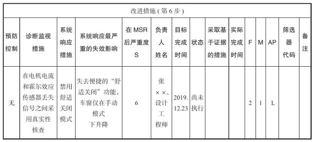 采取了一些改善措施后,可能会把MSR后的严重度下调,比如从10分调到6分。如果监视和响应措施有效,M的分数也会下调,本书案例原来M=10,采取措施后为M=1。因为没有采取防止失效原因发生的预防措施,所以F的分数没有下降。如表5-9所示。