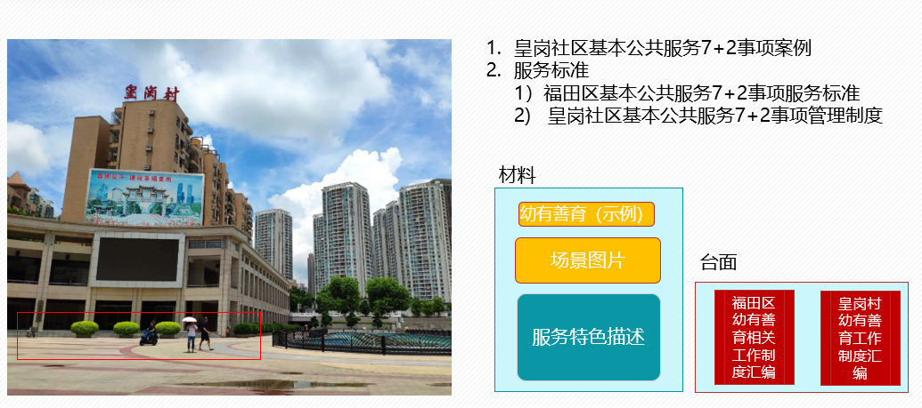 皇岗社区地处中心城区,是“3+9示范点”中唯一的城中村类型标准化综合试点,牢牢把握城中村这一特色定位,结合皇岗社区人口结构和历史文化背景,提升皇岗社区基本公共服务综合水平,打造花园式、精品化、宜居型城中村,提供城中村优质基本公共服务标准化建设范本。