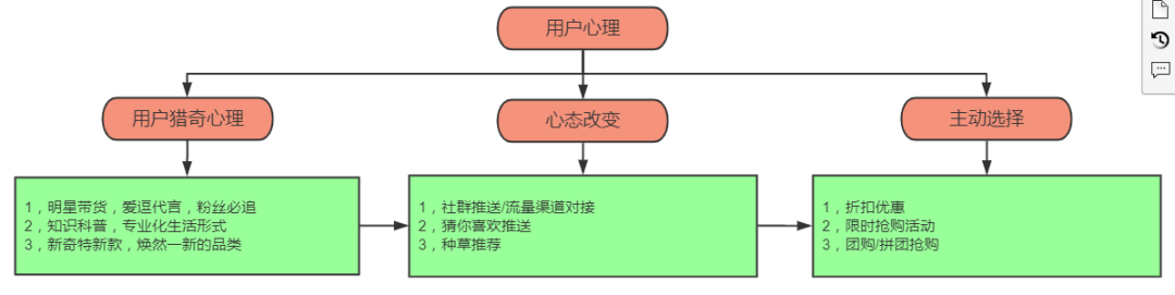 先从用户购物决策心态开始聊,对于带着指定购物需求的用户而言就好处理,只要平台内商品足够丰富,满足他们快速找到商品的产品体验即可。难点就在于第二种用户,也就是没有购物需求的用户,对于这部分用户用图1-5给大家拆解用户心态变化和应对策略。