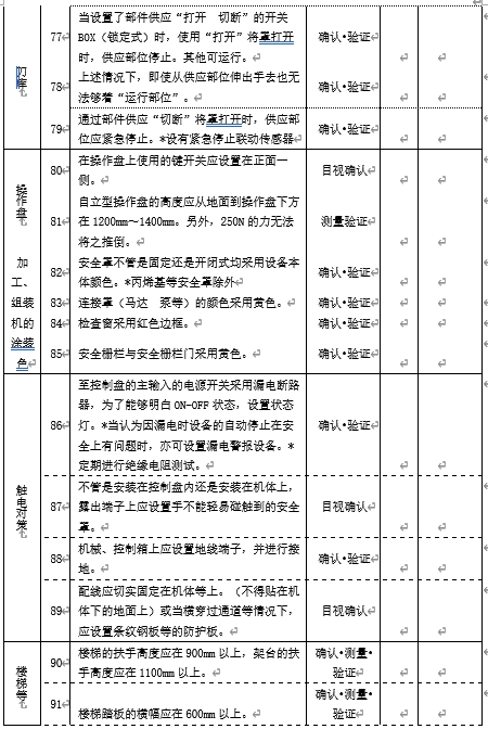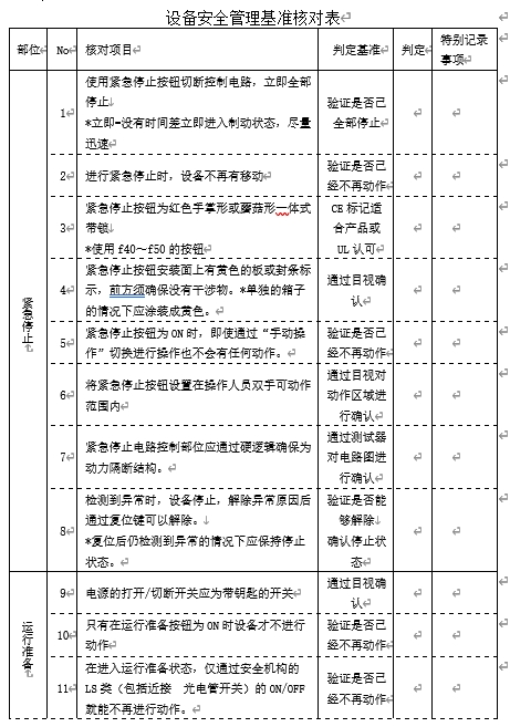 完成设备及作业安全专项点检分类后,就需要制作相应的专项检查表,如分解成设备安全专项检查表(如果设备多,且存在的问题点也多时,还可以再进行详细的分解,分解成异常停止开关点检表、光电安全感应装置安全点检表……,至于是一起点检还是分解成更细的专项点检,各企业可根据企业实际状况进行设定)、作业安全专项检查表等,对各项问题分门别类的进行检查确认,具体如图9-23及9-24所示。