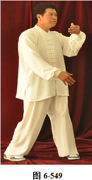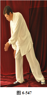 右云手:接上式,腰微含向右外转, 右脚以脚跟为轴往右外转脚尖。左脚以脚尖为轴往左外转脚跟,身体随腰右转,面向西南;腰向后拱,重心落于左腿,成下倚坐式。右手随腰后拱,右下摆至右胯侧旁。左手落于左腿侧旁;腰上提走弧形,左掌随腰向右前穿掌,重心落于右腿上。腰微提,左脚随腰提向左顺开一步,掌心向右,上身微俯(见图6-544至6-548)。腰上提身体直立,左掌抽回胸前,高与乳平,掌心向里。右手弧形回至腹前,掌心向里。左手在上, 右手在下,两臂圆撑,脊背后倚。