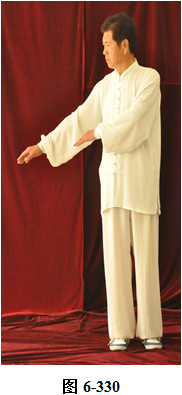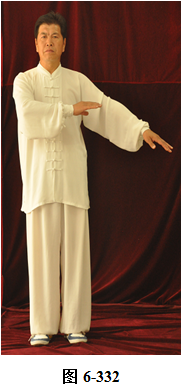 接上式,腰上提往左旋转,身体随向左转动,眼神也同时随之向左看。挤式不变,跟随身体也向左转至正南,向上方插掌,右脚随之内转,脚尖朝向正南;腰微拱,插掌的两臂顺势向下採,重心落至右腿,呈微倚式;腰向右外旋传,面侧向西北。两臂随之翻转向右后,左手掌脱离右手腕,两掌指尖斜指向地面,两掌心朝下; 左腰上提,左脚提起,向左外开,脚尖朝向正南,与左肩垂直平行。右腰同时上提向左转,两臂随向左划大平弧,摆向正南,呈左弓步; 腰随之后拱向左外撑,重心移至右腿,两臂继续划圆,随重心转移后坐,收之腹前。左手里旋翻,手心朝上,两掌心相对合在一起(见图6-329至6-336)。腰微拱旋转向右,两掌相合的右肘也随之微转, 稍斜向西北,打出右边肘;腰回转微含,随之上提,右臂顺势向右外打开,右掌变勾手,向右上方平送,略高于右肩,左手仍置胸前; 腰微拱向左外转,提左膝,左脚向左前上方迈出一大步,脚尖朝向东南。 身体随转面向东南,右脚随之内转。左腰继续上提,左臂随之掤出,成左弓步。腰微拱,身体稍后倚 将掤出左掌顺势内旋翻,掌心向下採按至腹前。腰随即上提,左掌顺势向左前上方推出。