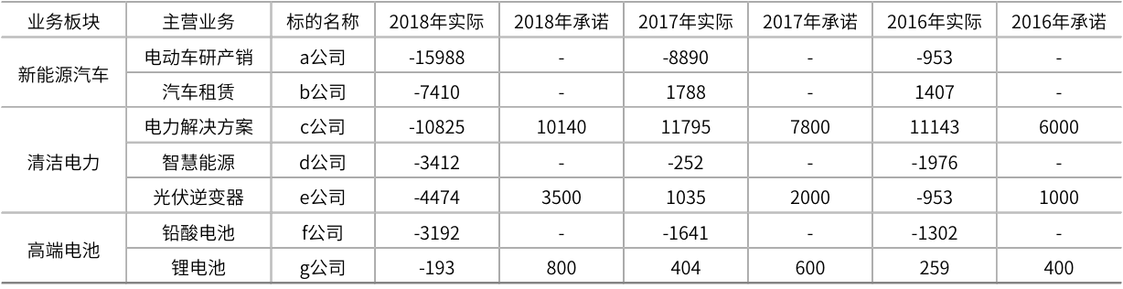 某上市公司C以铅蓄电池起家,在2015年决定向新能源领域转型,开始了持续3年的并购整合。该公司在3年内开展了数十次并购,其中最主要的共有7家并购标的。这7家标的中,除b公司和c公司在2018年以前还是利润担当外,其余企业几乎均在亏钱。表8-13展示了该上市公司于2016—2018年所收购的主要企业净利润表现情况。
