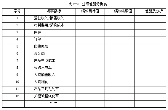 明眼人会发现,表2-2中的观察指标,并不是只看收入、利润、资产,而是将重点放在前六个指标上。稍微有点财务经验的人员都清楚,对于利润和净资产指标,人为可调整的弹性空间实在是太大了,但营业收入/销售收入(代表已获得的收入)、材料费用/采购成本(可计算出企业毛利判断产品附加价值)、库存(变现能力)、订单(企业现在及未来的市场状况)、应收账款(资金管理能力)、现金流(企业支付能力)这六个相对刚性的指标数据上,由于它们之间有非常缜密的内部逻辑,很难对某一个数据做假而不在另一个数据上露出破绽。只要控制好这六个关键数据,就能持续给内部运营以压力,通过强化执行力来提升运营绩效并改善业绩差距。