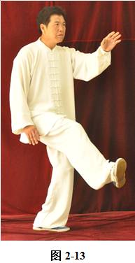 (1)右式踩腿:身体立正,两手上抬,右手经胸前,向右后下弧形引拿,掌心向下;左手掌前伸,撩闪人的面部。两手臂弯曲,不要伸直;同时,右腿抬起,用右脚掌心向前下方踩。做此动作时,身体略含下蹲,双手同时前后分开,左膝弯曲350,重心落于左腿,眼神目视前方(见图2-13)。