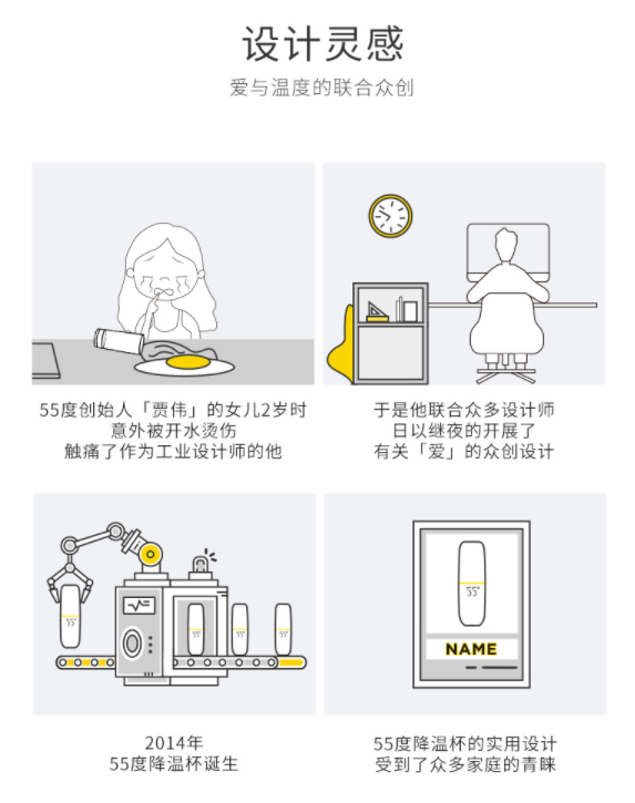 洛可可公司快10年的时候,所有设计师说:“我们天天给世界500强企业做设计,也给自己做一款设计吧。”然后,贾伟说出了这个埋藏心底的痛:要设计一款不会烫坏孩子的水杯,可以快速降低温度的水杯。终于,贾伟和他的团队用了3个多月的时间一起做了一个杯子:100°的水倒进去,摇一摇,就变成了55°。这个55°水杯,就是贾伟送给女儿的安全之杯。如图2-17所示。