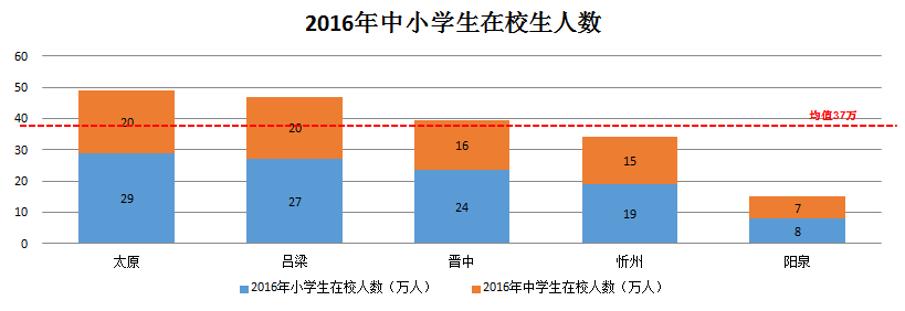 从小学生2016年在校生人数看,太原城市群2016年小学生在校人数为106.6万人,占全国小学生在校人数9913万人的1.07%;太原城市群5个城市小学生在校生人数总涨幅为-3.8%%;重点关注城市太原及晋中。