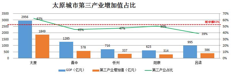 太原城市群整体第三产业增加值占GDP比重为53%,高于全国51.6%的平均水平;从产业发展潜力看,5个城市中,城市第三产业占GDP比重>城市群整体占比53%的有1个,为太原;城市第三产业占GDP比重超过50%的有1个,为阳泉。