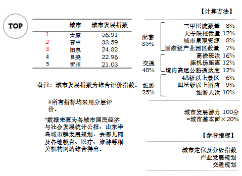 太原城市群城市发展指数TOP3的城市为:太原、晋中、阳泉。