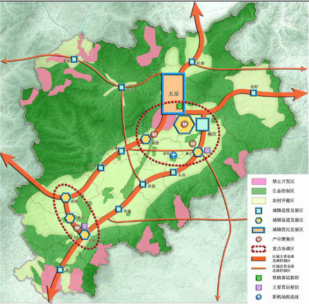 太原城市群将“东融西进、外疏内联”定为综合交通的发展目标。具体包括完善区域通道,重点加强与环渤海的联系,提升太原交通枢纽的地位;加强煤炭运输通道建设;整合客货运枢纽建设;建设重要旅游景点与支线机场、高速公路、干线公路之间的便捷通道,实施“一小时通达”工程。