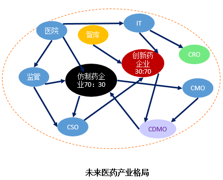 在我们投入大量资源进行创新药发展的时候,不会盲目进行投入和运作,一定会以终为始,预测一下未来的市场格局和需要。综合与大量药企掌门人和市场总监的访谈及沟通结果,大家有一个共同的感觉:未来的中国医药市场格局,创新药市场会越来越大,过专利期的所谓原研药市场量不会有大的萎缩,但价格会大幅度下降,导致以销售额统计的市场份额会大大缩小,而以辅助用药为主的“神药”市场份额会大幅度下降,通过仿制药一致性评价药品的数量会有较大提升但价格会下降,导致以销售额计的市场份额会大幅度下降,会形成欧美日市场今天的局面,就是创新药在数量上可能在三分之一以下但销售额会在三分之二以上,相应的仿制药市场数量会在三分之二以上但销售额会在三分之一以下(如图2-8)。