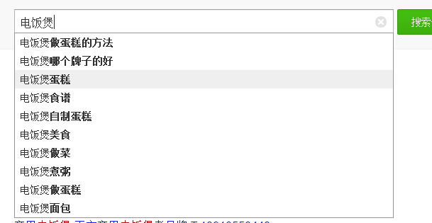 百度搜索框还有一个功能,就是输入“电饭煲”这个关键词就能跳出相关关键词。看完之后,我们可能还会查看百度指数,挑出一个最合适的关键词来做。因为有些词容易,有些词很难,要做到先简后难。
