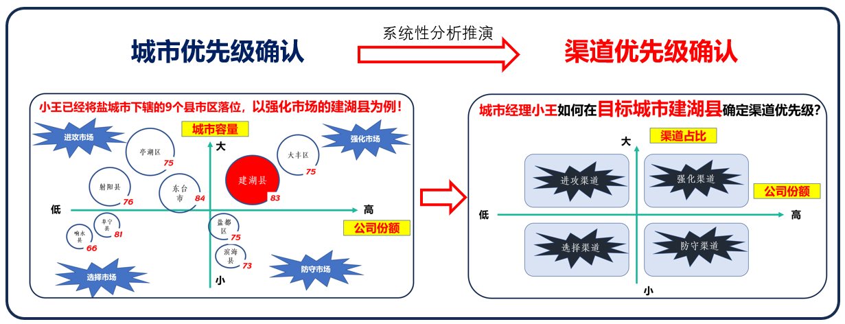 顺着前文盐城市的案例,从案例中城市主管通过“城市优先级矩阵”工具的推演和综合打分,已经确定了建湖县作为强化市场的第一优先城市,接下来我们将通过“渠道优先级矩阵”工具进一步推演和识别渠道的发展优先级。如图4-4所示。