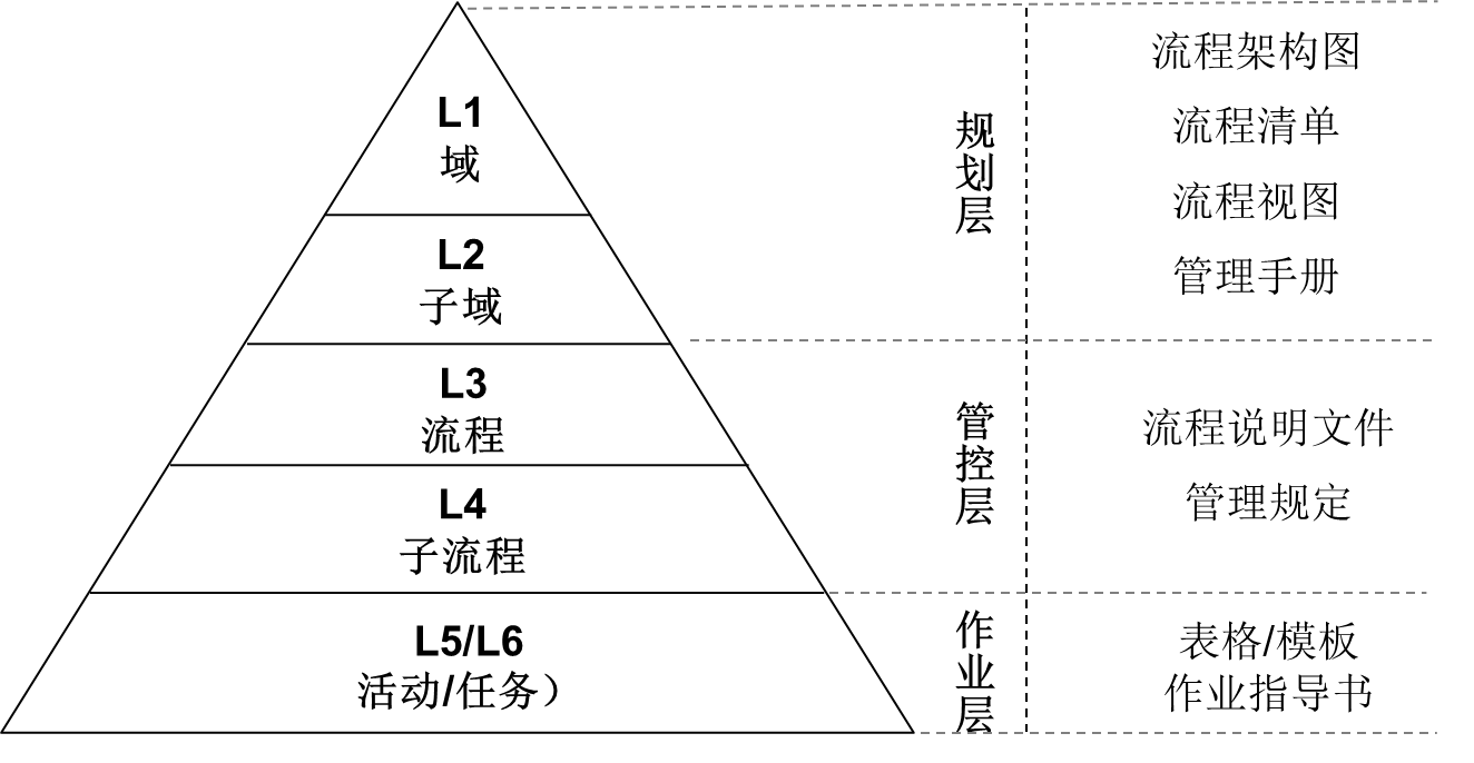 规划层定位为流程文件体系的纲领性文件,规划层与流程架构中一、二级流程相对应。要保证流程体系方向正确、策略或原则合理、结构适宜,主要包括各类管理手册及流程架构文件(包括流程架构图、流程视图、流程清单)。