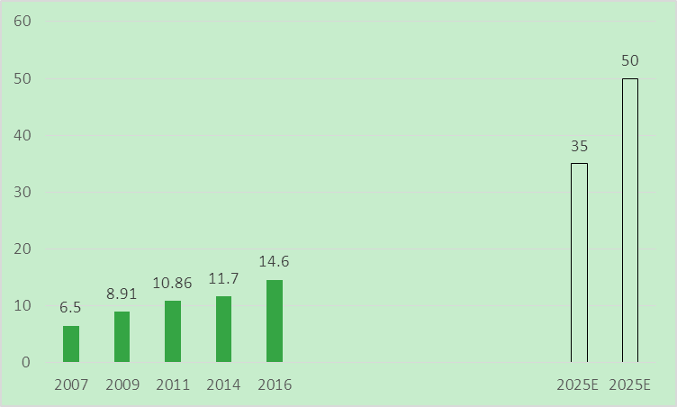 未来十年,创新重磅产品的陆续上市和并购整合进一步加剧,医药企业规模会持续突破,入围门槛必然节节攀升。过去十年,制药百强的入围门槛的复合增长率为9.4%。如果保守预测,未来十年,入围门槛的复合增长率为10%。那么2025年中国医药企业要想进入百强,销售规模的底线约为35亿。如果乐观预测中国医药企业的发展速度,入围门槛的复合增长率为15%,那么中国医药企业要进入百强,销售规模的底线至少为50亿元。如图8-1所示。
