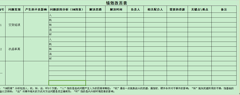 (5)考核结果的运用。考核结果的运用,是根据制度来的,是整个绩效管理实施的一个环节。在进行绩效改善的时候,应该有一张有关绩效改善的表格,如表3-5所示。在绩效管理的过程中发现问题的时候,都可以通过表3-3来进行分析,将分析结果作为工作的一个指导。通过绩效改善表,让公司的管理者和被考评对象明白,绩效改善的目的就是为了提升。绩效改善表,是企业在进行绩效管理过程中一个必备的工具。