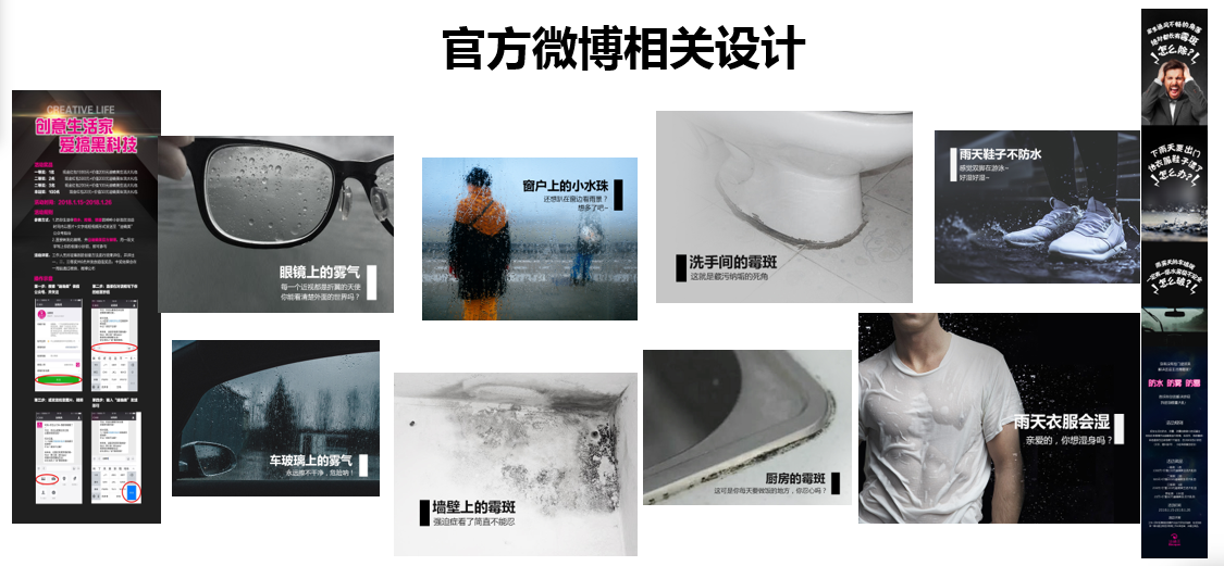 场景是产品策划最好的方式,针对迪确美产品应用的三个主要场景:家居、出行、开车,结合其产品卖点,打造迪确美“三大黑科技”:家居防霉、出行防水、开车防雾,解决用户家里墙体发霉、下雨天出行鞋子容易被打湿、汽车玻璃容易起雾这三个痛点。如图7-17所示。