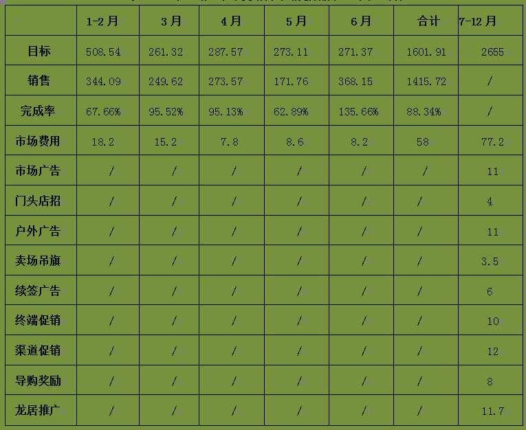 原计划投入的77.2万元将重新进行分配,按照计划调整的三原则:总销售目标不变,仍是4334万元,下半年实际销售任务2655+186=2841万元。由于销售未达标属于区域的个别现象,故需要在确保持续提升知名度的基础上(确保广告投放费用),适当降低终端促销费用与龙居场次的考核,通过开发和整改网点直接提升销量的方法,弥补可能形成的销售缺口496万元(该区域上半年度未达到企业销售目标,已经形成了销售缺口186万元。按上月销售额3%的市场费用支出,共支出费用58万元。下半年按88.34%的完成率计算的话,仍将产生310万元的缺口,两者合计形成496万元的销售缺口),具体如表5-3所示。