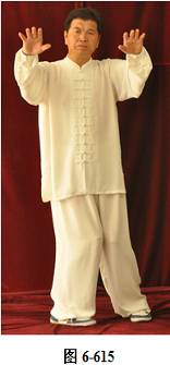 接之式,腰后拱,成后倚坐式,重心渐渐移至右腿上,左脚内转,脚尖朝向正南,身体亦转向正南;左腰上提,重心随即转向左腿上;右腰向右上提,随即右腿向右外上方开步,两臂随之外旋向两侧打开,与肩平行,两手心向下;左腰向右上提,重心随之渐渐移向右腿,两臂随之下垂,左臂置于左膝外侧,右臂落至与右膝垂直;左腰微提,左臂与左腿同时向右并拢,成蹲式。左右两臂交叉, 左手臂在上,两手心向下;腰上提,身体直立,两臂随身体直立, 呈十字,两掌翻转,手心朝外,眼神平视。(见图6-615至6-618)