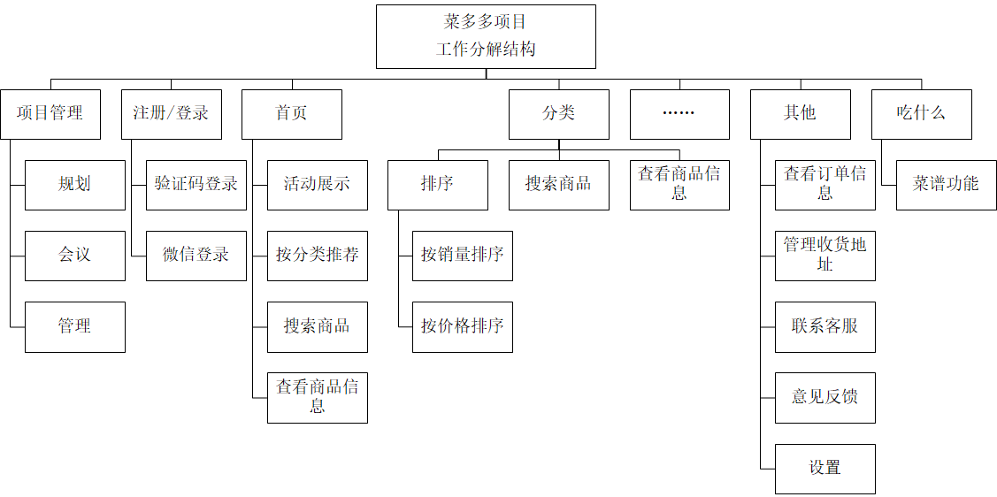工作分解结构是制定进度计划、资源需求、成本预算、风险管理计划和采购管理计划等的重要基础。工作分解结构包含产品范围和项目范围。所以,菜多多项目工作分解结构除了包含各种技术工作、主要可交付物,还包含项目管理工作。如果有外包工作,也应该纳入WBS中。创建WBS常采用自上而下的方法,以项目主要可交付物或者项目生命周期各阶段作为分解的第二层。如图8-12、图8-13所示。