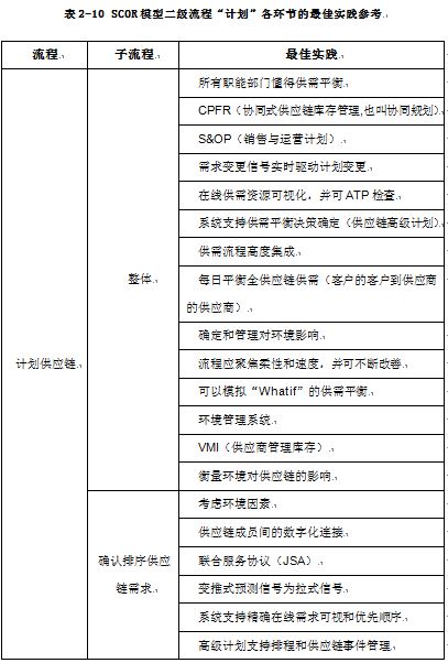 以供应链二级流程“计划”为例,SCOR给出了不同环节最佳实践参考,有利于企业参照建立或优化相应的流程,来达到业务模式的提升,如表2-10所示。