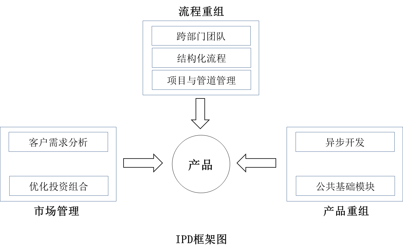 最先将IPD付诸实践的是IBM公司,1992年IBM在激烈的市场竞争下,遭遇到了严重的财政困难,公司销售收入停止增长,利润急剧下降。经过分析,IBM发现他们在研发费用、研发损失费用和产品上市时间等几个方面远远落后于业界最佳。为了重新获得市场竞争优势,IBM提出了将产品上市时间压缩一半,在不影响产品开发结果的情况下,将研发费用减少一半的目标。为了达到这个目标,IBM公司率先应用了集成产品开发的方法,在综合了许多业界最佳实践要素的框架指导下,从流程重整和产品重整两个方面来达到缩短产品上市时间、提高产品利润、有效地进行产品开发、为顾客和股东提供更大价值的目标。