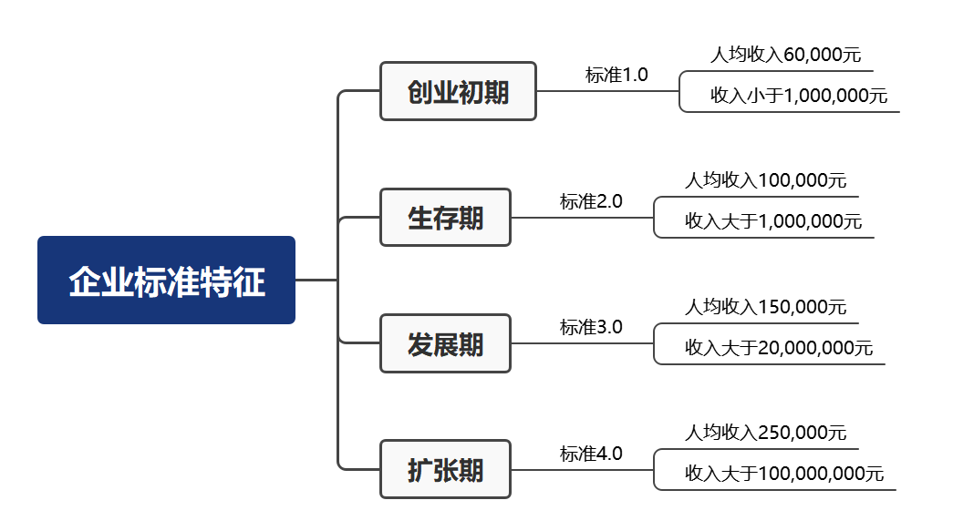 最终,当企业步入扩张期时,人均收入大幅提高,企业开始具备一定的知名度。在这个阶段,企业对于招聘员工的考核标准变得更加严格,以确保新加入的员工符合企业的发展需求。企业的组织方法健全有效,管理机构注重流程和制度的建设,内控环境得到进一步优化,形成管理标准4.0。此时,企业可能会考虑启动上市流程,以进一步提升企业的品牌价值和市场地位。