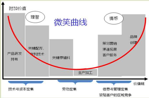根据微笑曲线理论,在产业链中,附加值更多体现在曲线两端的设计和销售,处于中间环节的制造附加值最低。