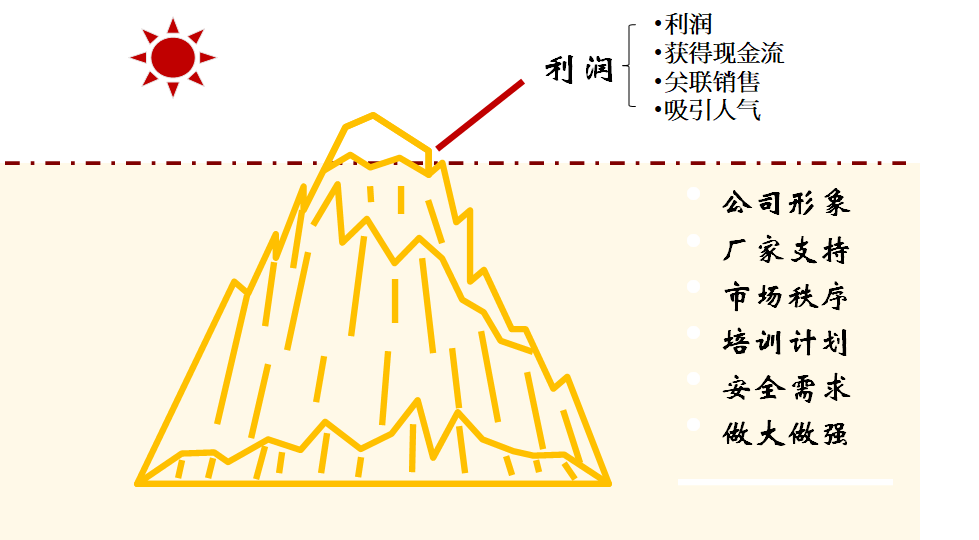 总而言之,价格、扣点、信用等销售政策虽然是客户与厂家合作最关注的,但这只是冰山一角,提升自身形象、厂家支持、规范的市场、管理提升,以及做大做强都是在冰山的下方,也是经销商合作的理由。不仅要关注经销商冰山上的需求,还要关注冰山下的需求;不仅要关注经销商的核心需求,还要关注其成长需求,而这恰恰是厂家渠道经理要强调但往往被忽略的,陷入给什么价格、能不能欠款的死胡同。