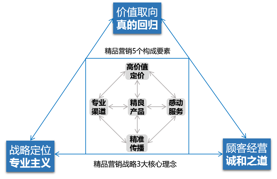 精品营销战略要求,企业在价值取向上祛除浮躁、“回归真实”,在经营战略上聚焦专注、坚持“专业主义”,在顾客经营上坚守初心良知、践行“诚和之道”。这三大核心理念相辅相成,具有内在的逻辑统一性。