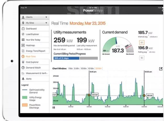 1、可视化仪表盘(Power Scope)是系统的大脑,根据历史数据、用电数据和环境数据对电量、电费做出预测,形成客户专门的用电模型,再制定相应的储能和放电策略,反应速度精准到秒,能够展示实时(而不是5或15分钟)的用电数据,同时智能地传达存储和部署电力的命令;