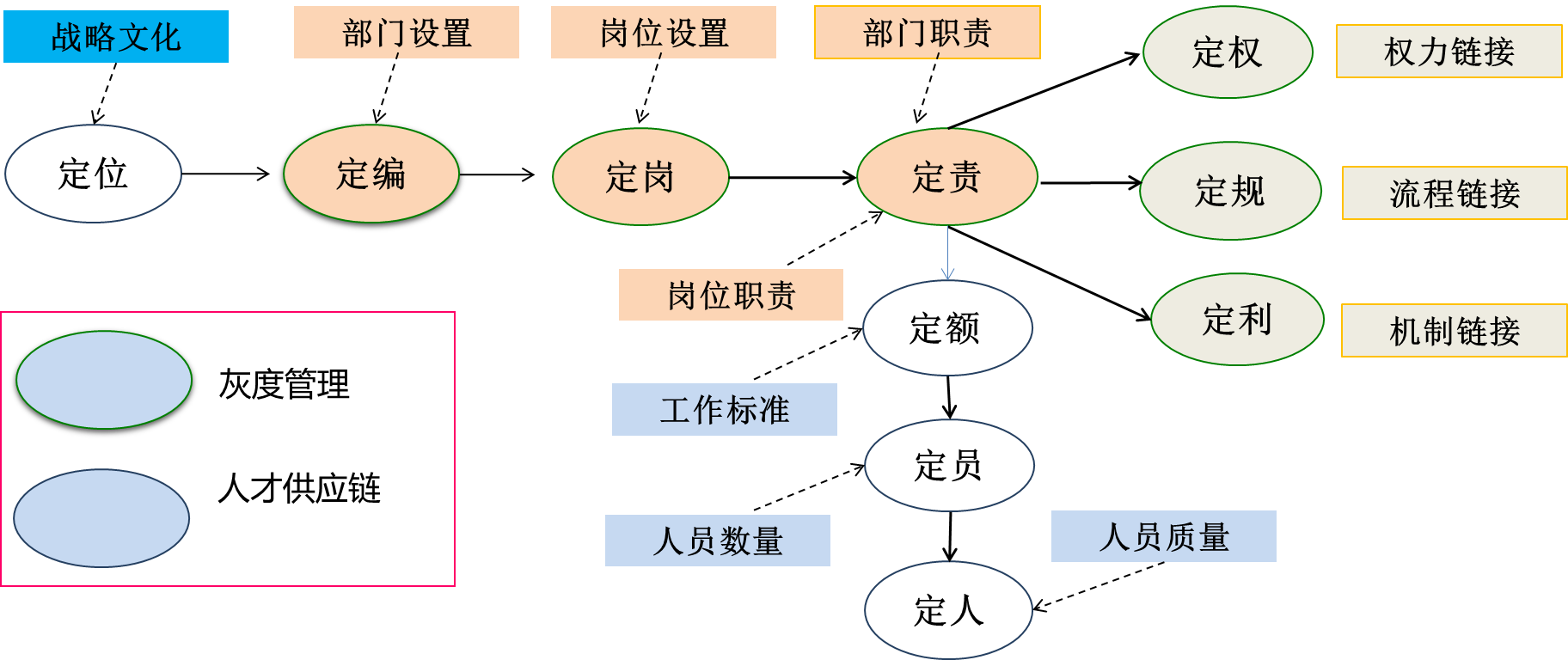 基于顶层设计“三大导向”的前提下,进行企业组织分工体系(定编、定岗、定责)与协同体系(定权、定规、定利)建设,再基于顶层定位并结合组织体系的要求,打造基于人均效能提升的人力资源体系(定额、定员、定人)。