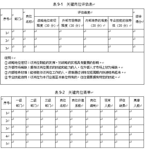 在第二部分“组织建设体系”中的第四章和第五章,我们分别梳理了企业的岗位编制清单,并进行了岗位价值的评估。在此基础上,我们进一步从“战略地位密切度占 30%”“外部市场稀缺度占 30%”“内部培养较难度占 20%”“专业技能独特性占 20%”四个维度进行评估,并根据评估的结果,挑选出企业的关键岗位。关键岗位评估表如表 9-1 所示,关键岗位清单如表 9-2所示。