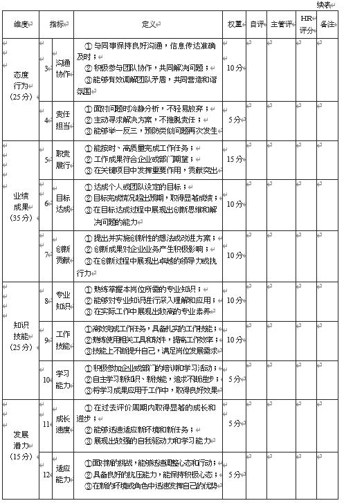 (3)​ 知识技能:主要是指人才对岗位专业知识和技能的掌握程度,以及对新知识和新技能的自主学习能力。重点依据来源于对被评估人的任职资格测评结果。