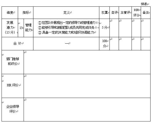 (1)​ HR 评分:由人力资源部(或行政人事部)综合被评估人的自评结果、直接主管的评价意见,以及通过“360 度评估”方式收集到的其他相关评价信息来确定。