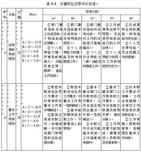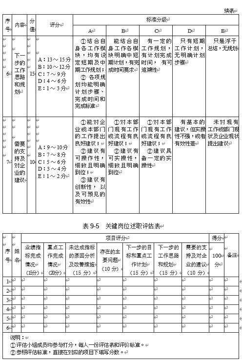 对关键岗位的人才做完评价和测评后,接下来还需要安排述职会。行政人事部应提前通知参加梯队人才评价的人员,准备述职PPT 报告,并做好述职会的相关准备工作。关键岗位述职评价标准及关键岗位述职评估表,分别如表 9-4