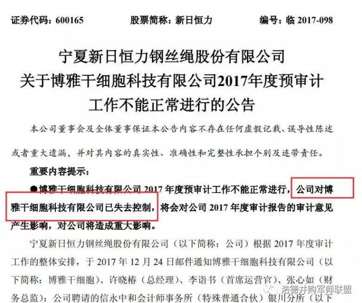 2017年12月26日晚间,上市公司新日恒力600165公告宣布:由于博雅干细胞不配合预审计工作,公司对博雅干细胞已失去控制。如图12-1所示。