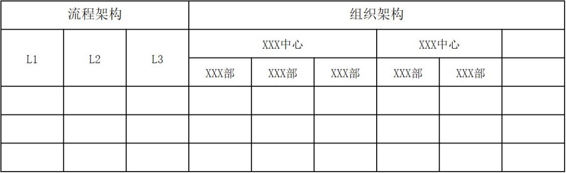 业务部门的设置需要通过流程架构(L1-L3,个别领域到L4)与组织架构映射表来确定,匹配表模板如下图所示: