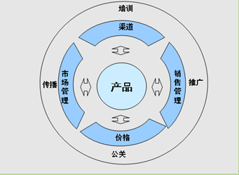 中国营销从4P、4C到6P(顾客、价值、产品、渠道、传播和品牌)等各种理论,其立基点都是以企业为中心的封闭式要素规划与优化。这种以产品为中心的营销战略模式,是中国企业普遍采用的营销组合方式。理论上虽然有将中心位置的“产品”换成“顾客”、“价值”、“品牌”等,但只是着眼点或视野不同,战略导向的自闭性并没有本质的区别(具体如图2-1所示)。
