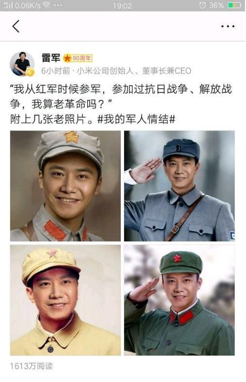 雷军微博截图与军装照活动示意图