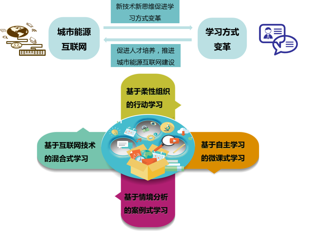 针对当前公司班组及员工的学习模式及现状,电力公司培训中心项目组在新型学习方式开发与实施过程中,构建适应柔性化、扁平化、无边界组织的学习方式,形成班组学习与员工学习的共同体,突出以自主、合作、探究为核心理念,相对于过去的“被动、机械学习”提出高质量的“行动学习”,相对于过去的“个体学习”提出“合作小组行动学习”,相对于过去的“接收学习”提出“探究学习”,最终形成灵活性更强微课式学习、结合情境分析的案例学习、基于柔性组织的行动学习和基于能源互联网+的混合式学习,并将多种学习方式进行系统地梳理与甄别,确立学习方式的统一实施标准,保证学习效果。总体思路如图所示: