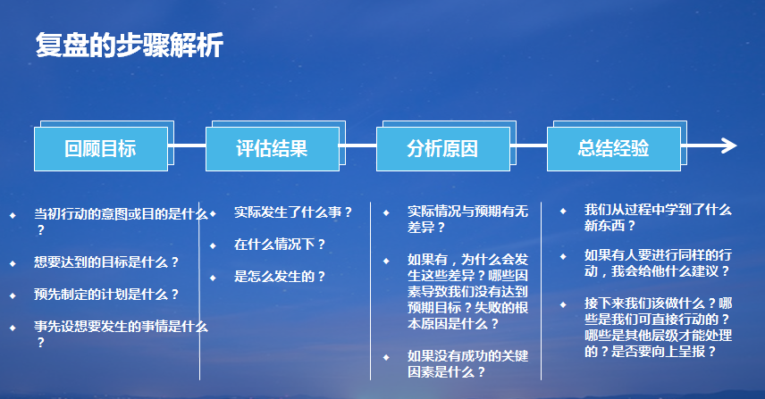 (3)事后全面复盘:大的项目或战略结束后,要进行总复盘,总结经验教训,找到规律 。