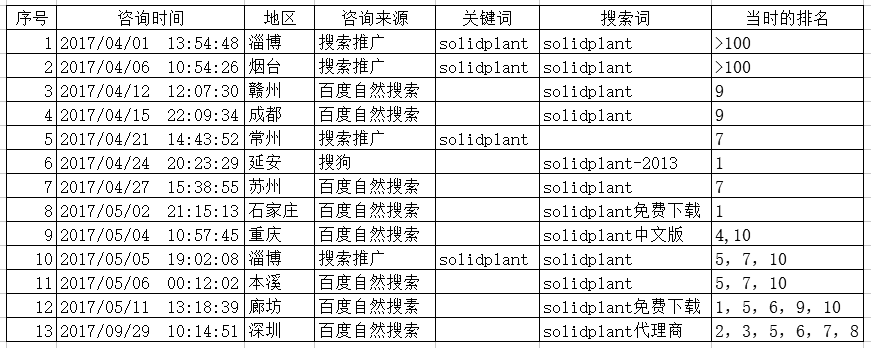 表8-1 关键词“solidplant”近期的排名和咨询情况记录