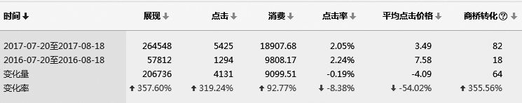图8-12 YD公司2016年7月-8月搜索推广数据与2017年同期对比