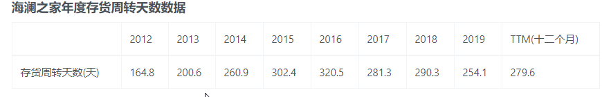 至于库存天数,过去12个月的数据= 365天/存货周转率 = 365/1.3次/年 = 279.6 天