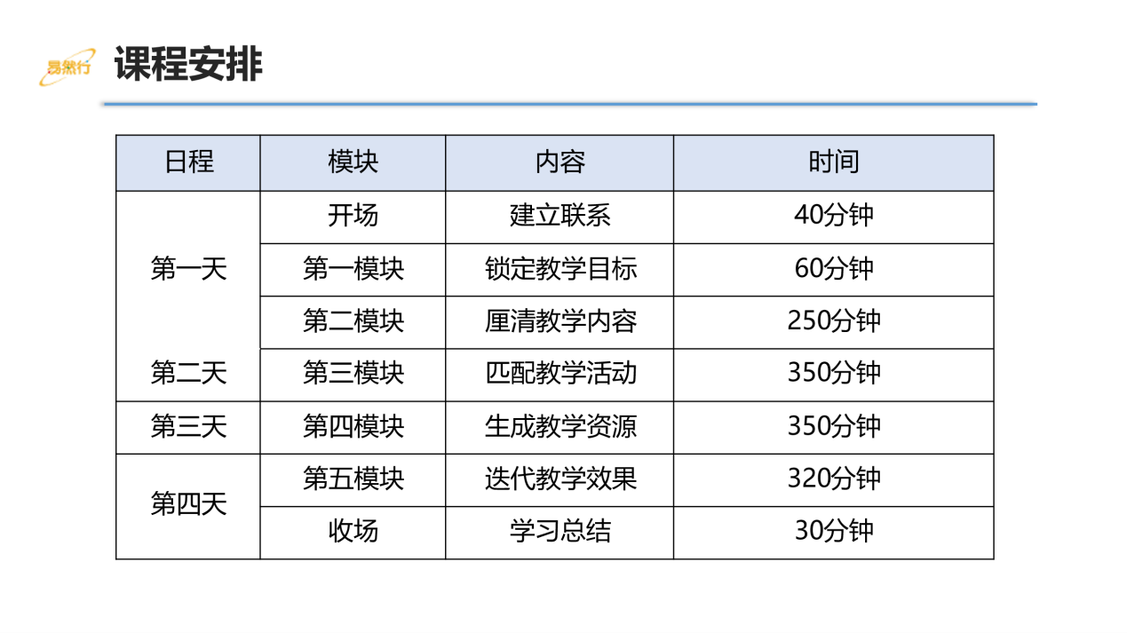 课程安排将日期、内容、时长予以明确,让培训师和学员清晰地看到课程的学习节奏,以便做好时间管理。此处的课程安排,主要是体现整块时间涉及的内容即可。