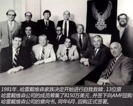 到20世纪80年代初期,哈雷机车公司已在破产边缘。高阶主管,包括哈雷机车公司原创人的孙子威利・戴维森(Willie Davidson)买下了全部产权接管公司。