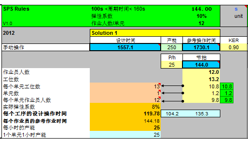 根据上述案例的节拍时间144s,各工序工时总和为1557.1s,目标产能250台,设定弹性系数为10%,ker为0.9,输入下图计算可得:当单元数为1,每个单元工位数为13个,作业人员数为12个,产能可达到25台/小时,那么10小时可达250台。